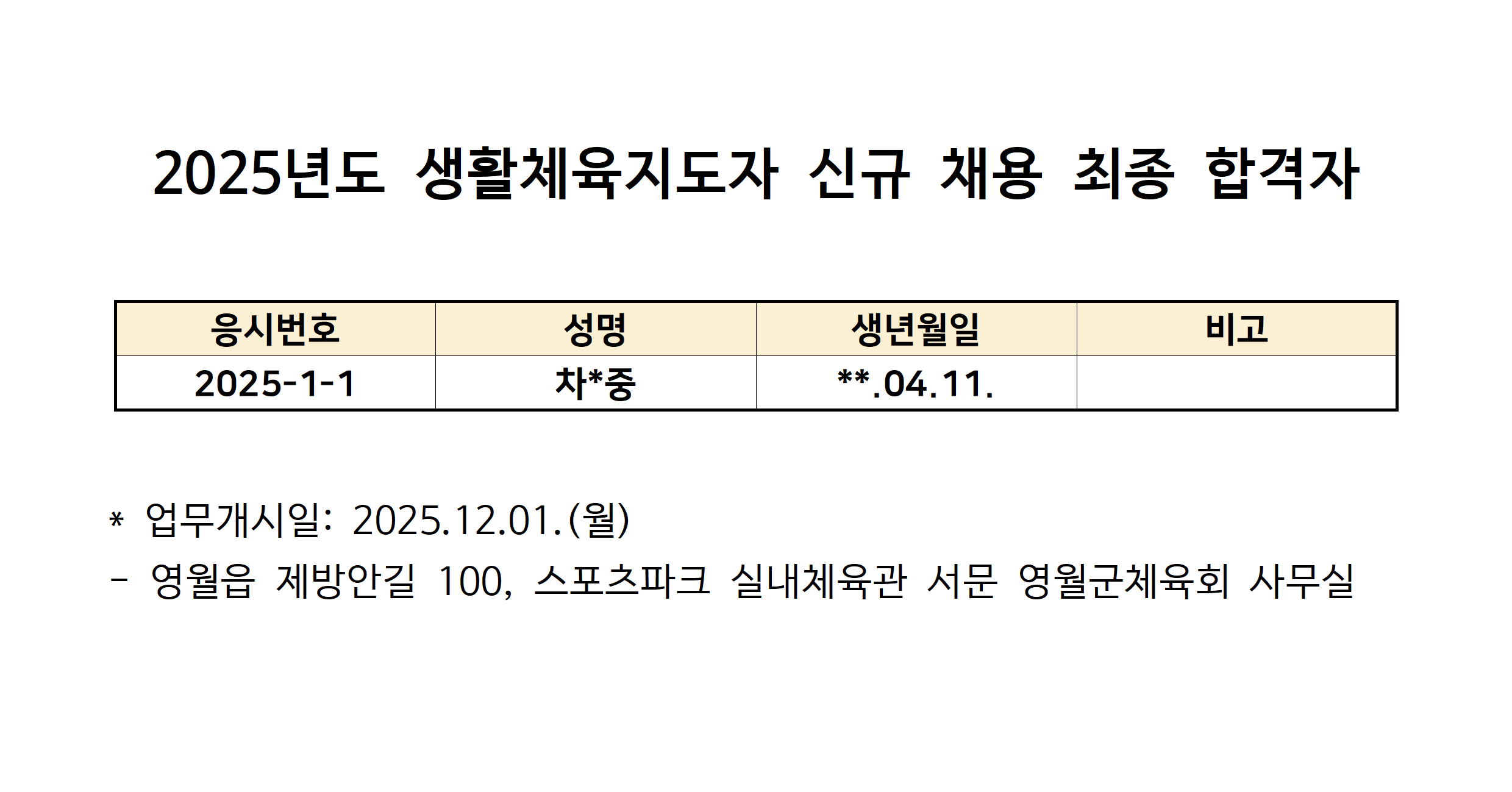 2025년도 11월 생활체육지도자 신규 채용 최종 합격자