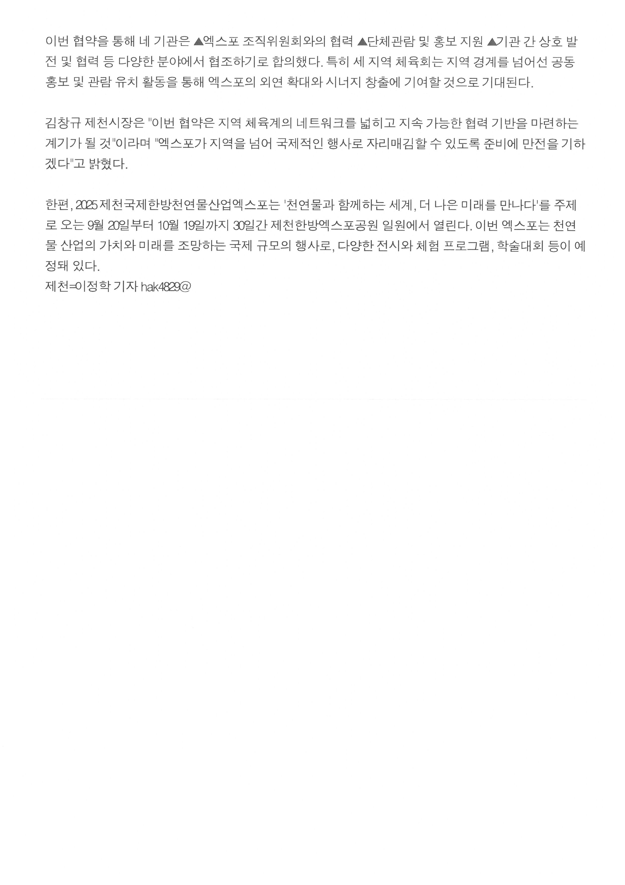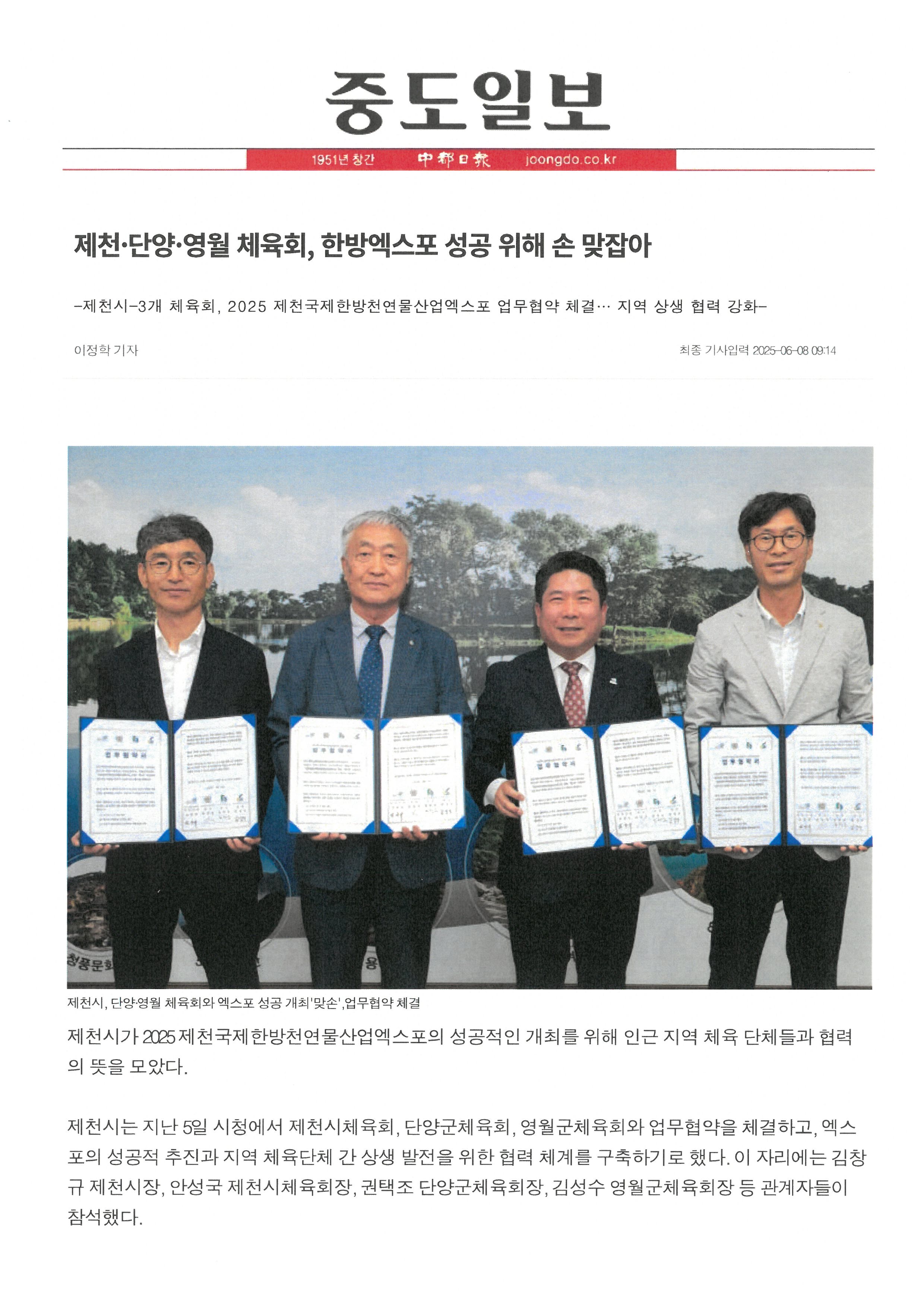 제천.단양.영월 체육회, 한방엑스포 성공 위해 손 맞잡아(2025.6.8.)중도일보 기사