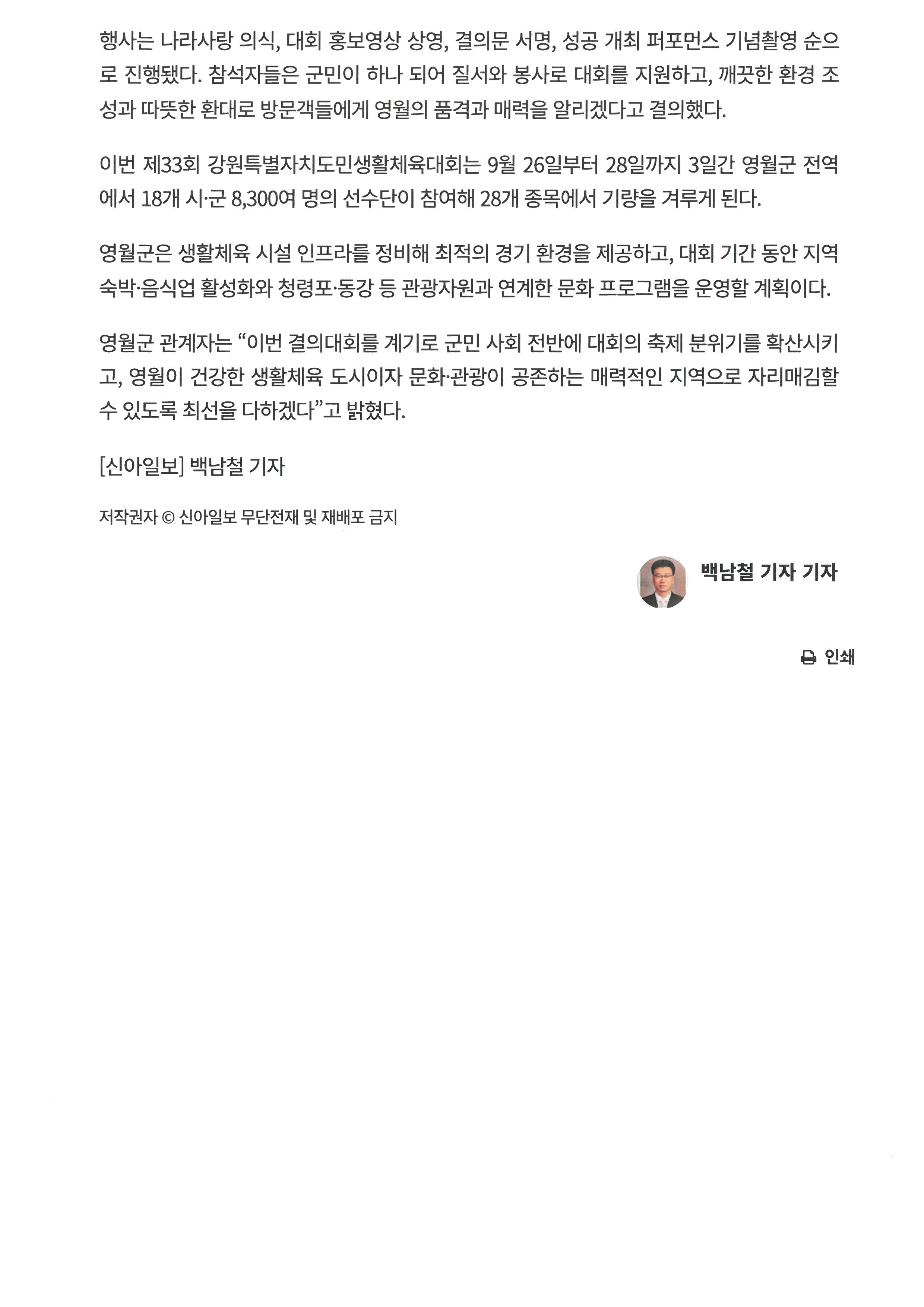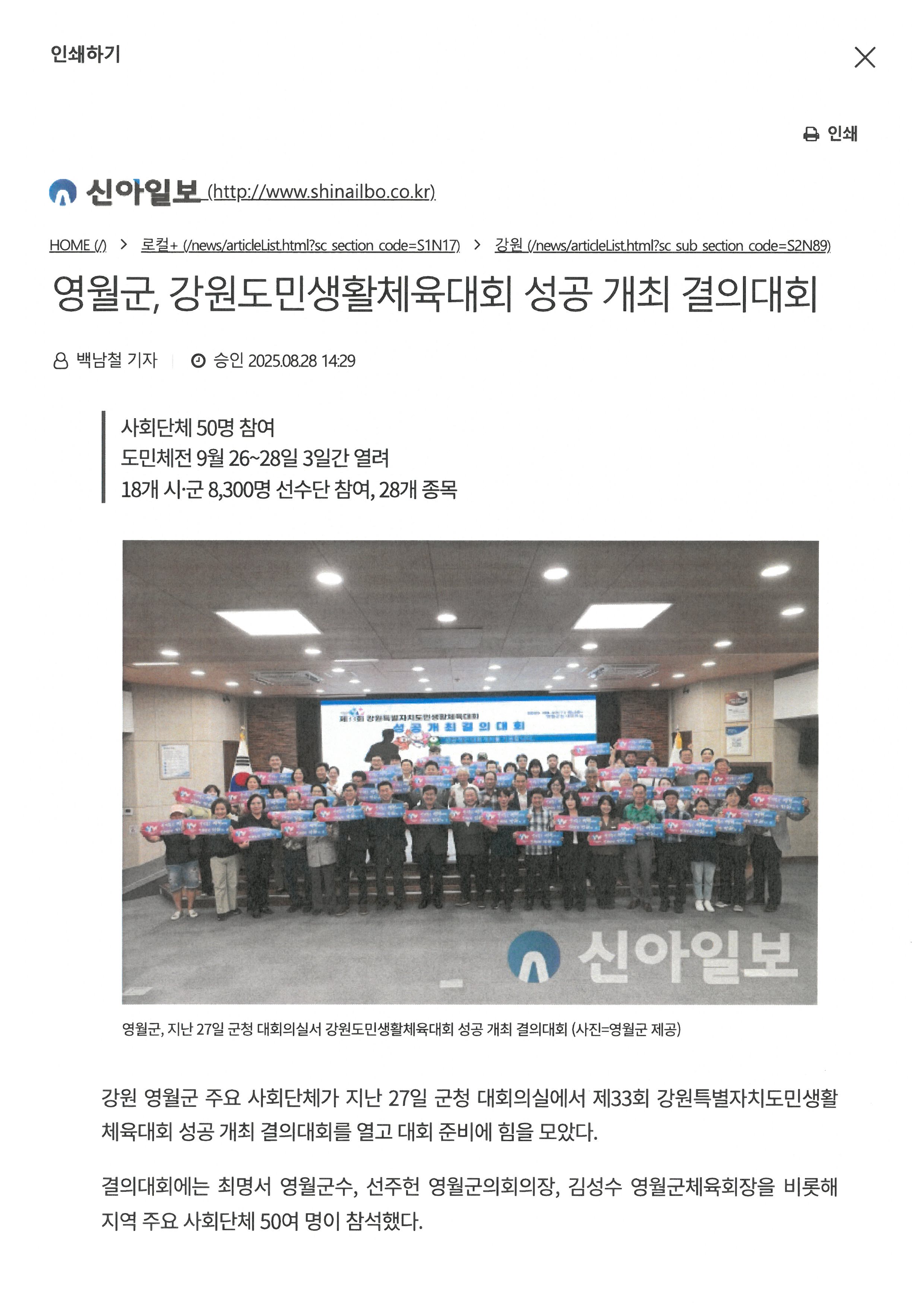 영월군,강원도민생활체육대회 성공 개최 결의 대회(2025.8.28.)신아일보 기사