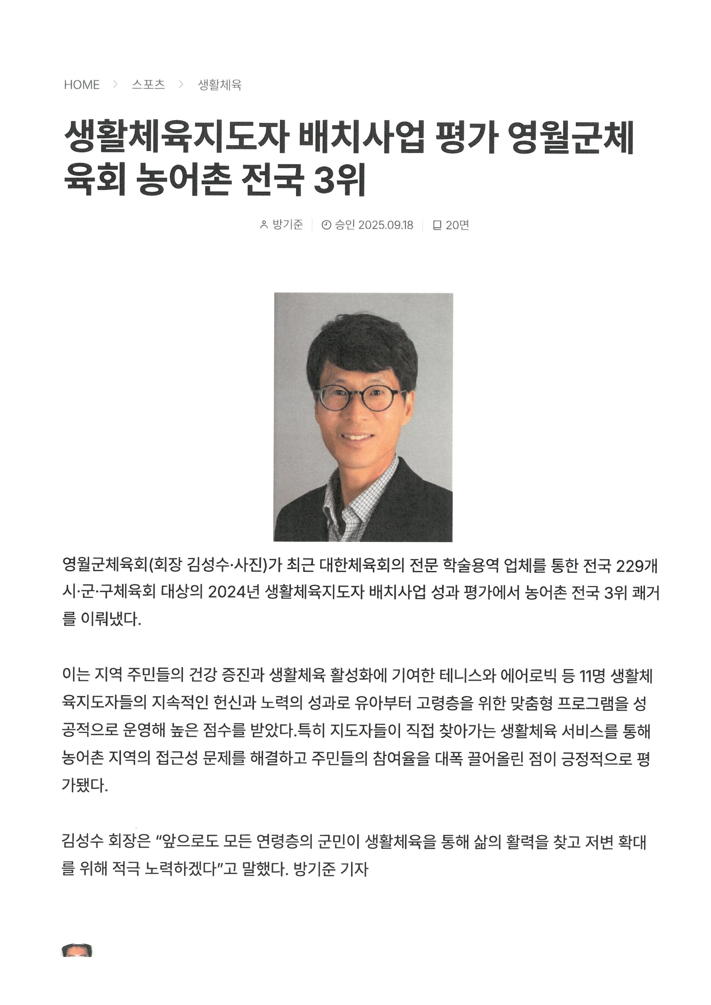 생활체육지도자 배치사업 평가 영월군체육회 농어촌 전국 3위(2025.9.18.) 강원도민일보 기사
